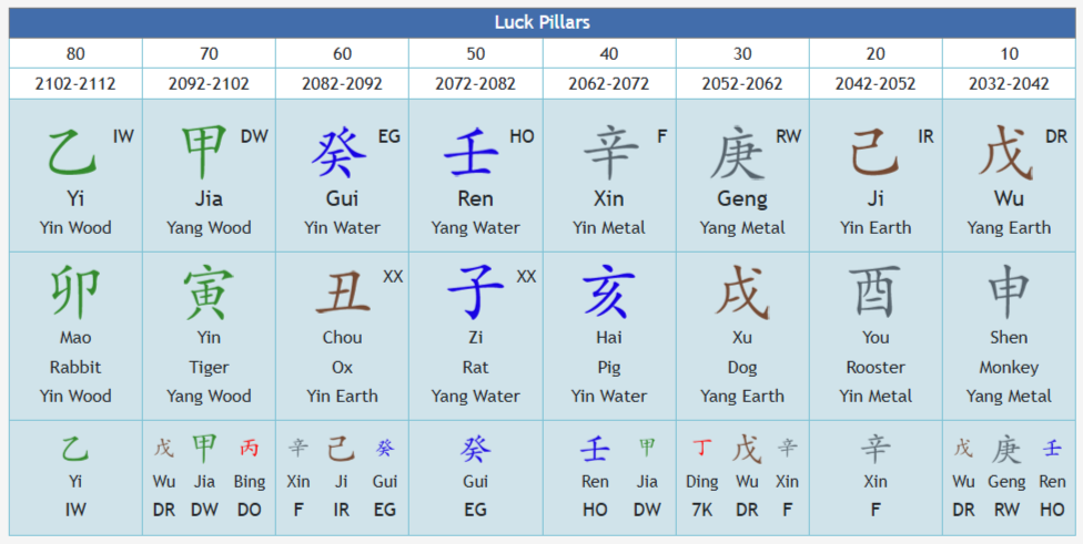 Les troncs célestes représentent la chance du ciel pour 33%, les branches terrestres représentent la chance terrestre pour 33% et les troncs cachés représentent la chance de l’homme pour 33%.